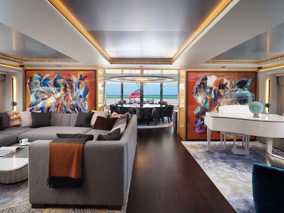 “Their passion for outer space and that feeling of being in another world meant so much, Galaxy became this, but it’s also their home on the water,” Colbon adds. “It touches the senses from head to toe, especially in the main salon which can be their very own private members club, a super comfortable space to chill in the afternoon, a movie theater and then transform into a nightclub where Dave can play his latest music track.”