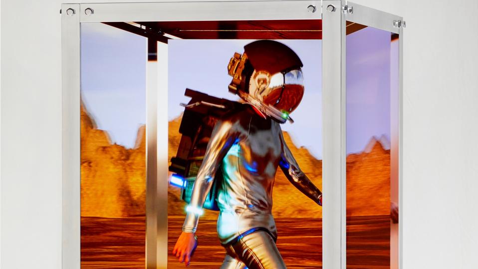 “HUMAN ONE” is a seven-foot-tall column made up of LED screens playing footage of a person in an astronaut-like suit walking through extraterrestrial, science fiction-esque backdrops as the column rotates to show viewers different angles.