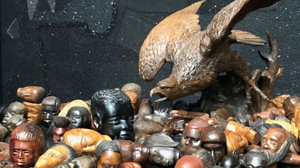 Look at “Untitled,” his 2018 work, a few dozen wooden souvenir heads of Black people, set on a table. Add an American eagle that looks like it’s deciding which eye to pluck out next, and suddenly you’ve got something meaningful.