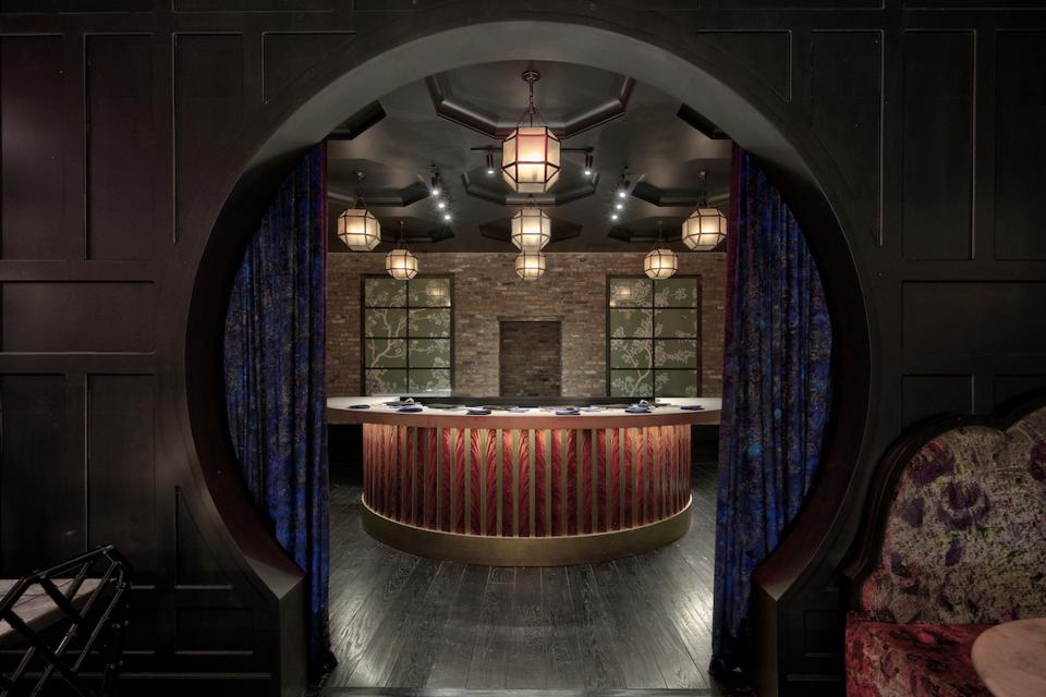 Noda’s 10 seat sushi bar provides guests with an intimate, extravagant sushi experience. Guests enter through a discrete doorway to a cocktail lounge outfitted with cobalt blue banquettes and sconces with red shades that lend the space a rosy glow. Behind the whimsical blue velvet curtains, guests are escorted through a signature moon gate and lead to the dining room. The white maple horseshoe sushi counter with lilac velvet stools centers the dark interior of dark brick and wood paneled walls.