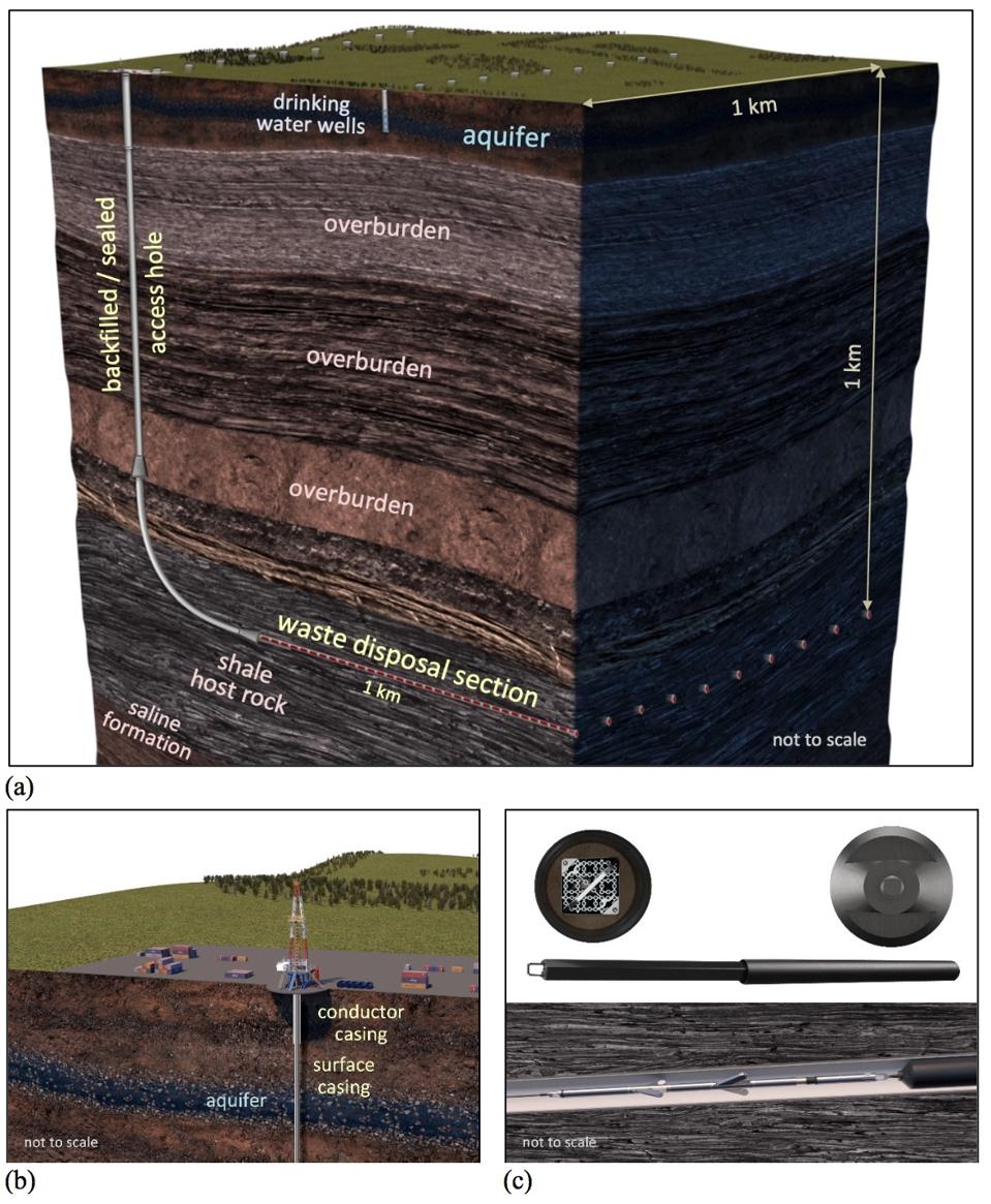 The figure above shows a schematic of a deep horizontal drillhole repository. (a) A vertical access hole is drilled to the kickoff point below confining layers, where the hole is gradually curved until it is horizontal, which is the waste disposal section holding the canisters. (b) During pre-closure operations, casings provide stability, protect aquifers and guide waste canister emplacement; (c) Individual nuclear fuel assemblies are placed into canisters which are capped; a tractor, coiled tubing or drill pipe is used to push the canister into the horizontal disposal section of the drillhole.