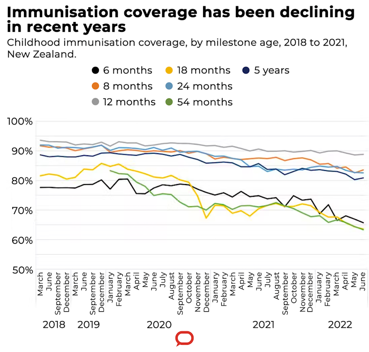 Immunisation coverage at six months of age has fallen in New Zealand from a high of around 80% in early 2020 to 67% by June 2022, and as low as 45% for Māori.
