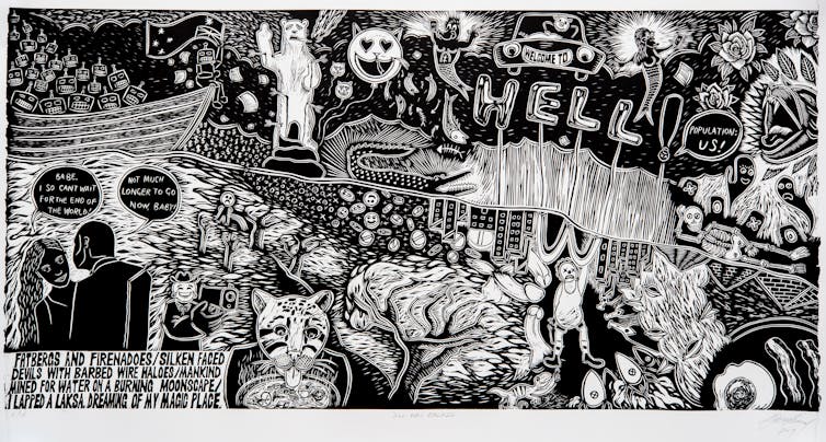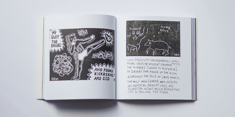 His dive into wood carving with the woodcut collective, Pangrok Sulap, at the Tamparuli Living Arts Centre in Malaysian Borneo, turns out to be both a return to his ethnic history and a return to the playfulness of his childhood. The resultant book is a graphic marvel.
