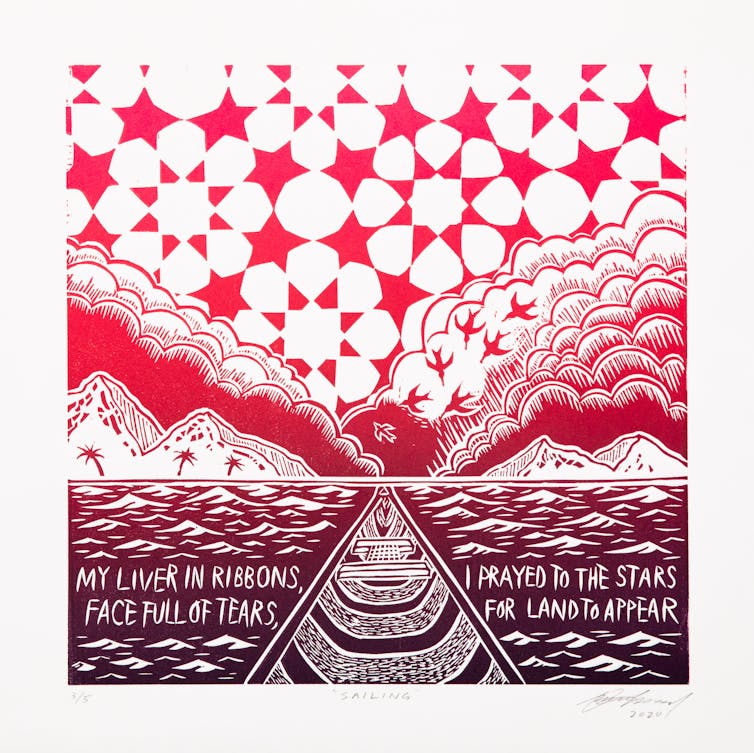 This sea surrounding it is the sea-road taken by his ancestors, the Perahu people, to Arnhem Land in the 1700s in search of the sea cucumber, a trade that linked Aboriginal Yolngu Country to Asia. With uncanny timing Omar Musa brings his Australian identity back to Borneo, re-inventing, reversing and re-creating old connections.