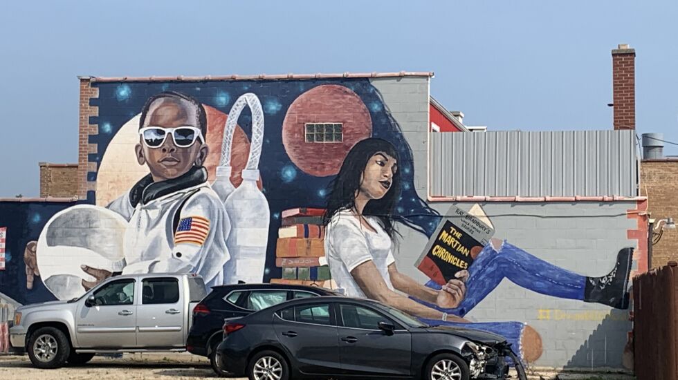 That first public mural, titled “Dream Big,” was done in Waukegan and featured an astronaut boy and a girl reading “The Martian Chronicles,” by Waukegan native Ray Bradbury.