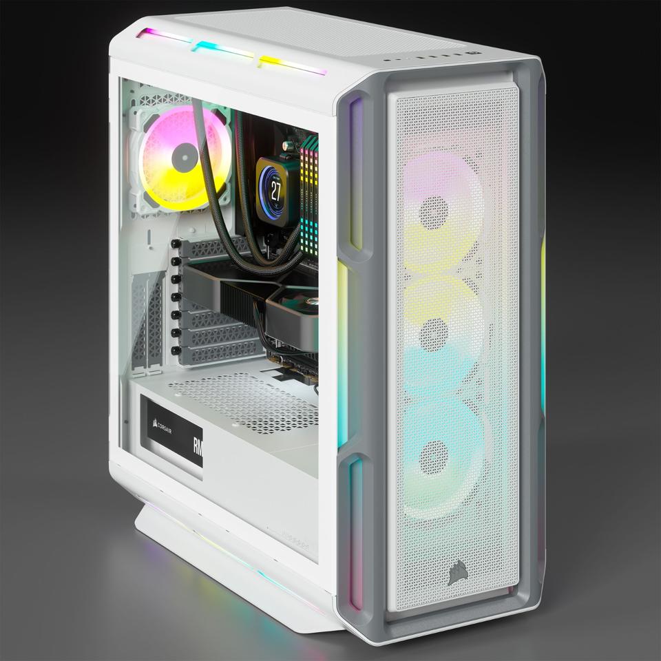 The 5000T is noticeably bigger than, say, any of NZXT’s mid-tower offerings. This means that there’s plenty of room for components and airflow, all of which (including the case itself) boast RGB that is controllable through Corsair’s iCue software. Also customizable is the LCD screen on the H150i Elite AIO, where you can display everything from system temperatures to the latest dank meme.
