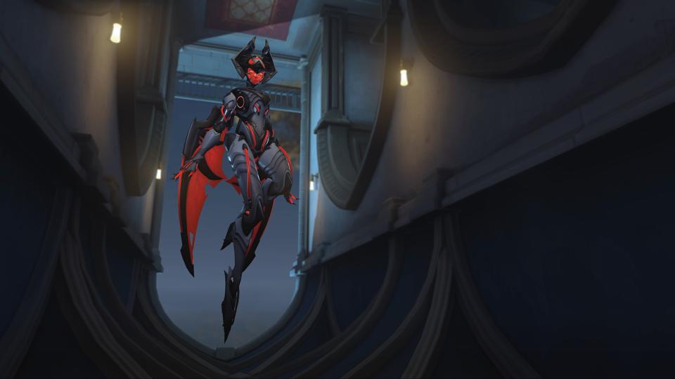 The skin blends gothic and futuristic styles with a black and red color scheme, bat wings and Echo’s red face positioned inside the bat’s mouth. It’s eerie, and a cool look for the game’s most recent hero.