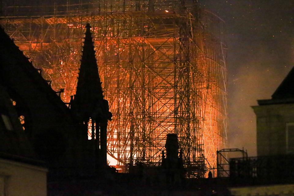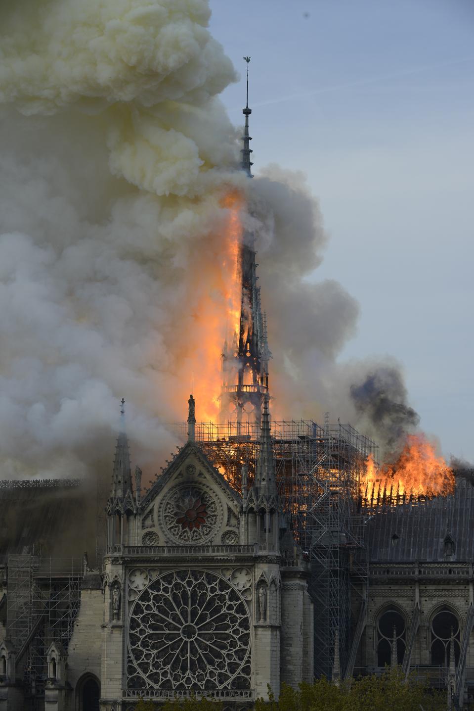 The fire broke out in the roof that was surrounded by scaffolding at about 6:30 pm local time on Monday evening and the flames quickly spread to the 93-meter-high spire that, after burning intensely, started buckling before falling through the roof.