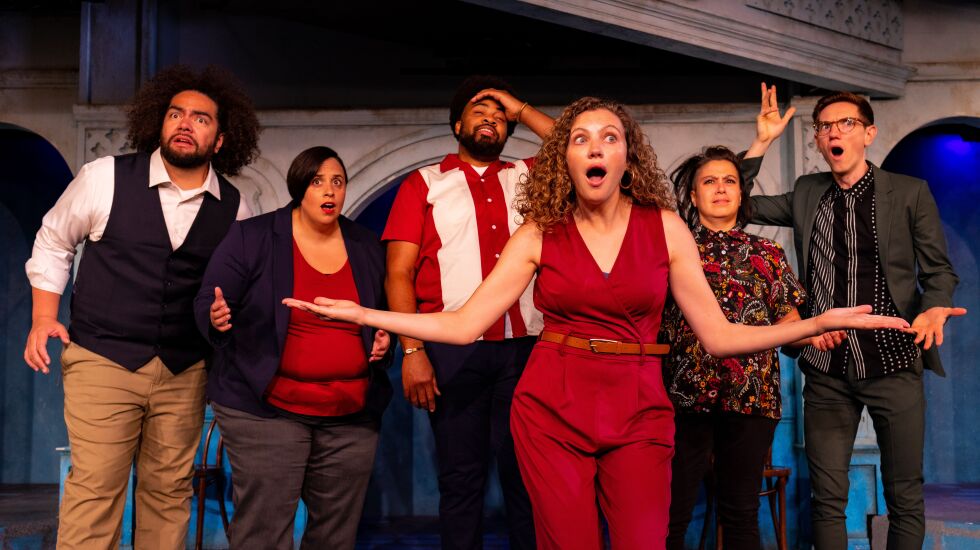 As usual, a few drink sippers in the front row are commandeered to provide material for the cast’s sure-handed improv. One becomes the subject of vignettes strung together by music director Tilliski Ramey’s lyrical narration. Another gets “pulled over” for Driving While White by payback-minded cops of color (Terrence Carey and Martinez), who interrogate him about Patagonia and “Friends.”