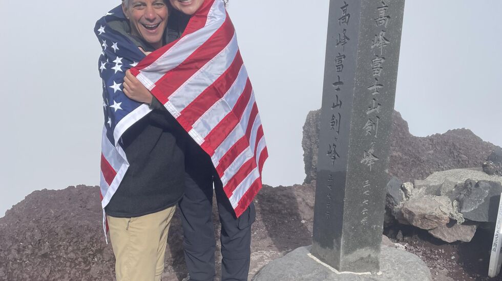 Former Chicago mayor Rahm Emanuel, our U.S. ambassador to Japan, sends word he just climbed 12,467 foot Mt. Fuji, and did it in record time with wife, Amy, and daughter, Leah. They slept in a hut to capture evening and sunrise shots above the clouds. Then he wrapped himself and daughter, Leah, in an American flag. Now Isn’t that what ambassadors do?