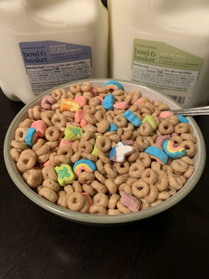 Cereal (honey flakes), mac and cheese, cheedar, and oreo.