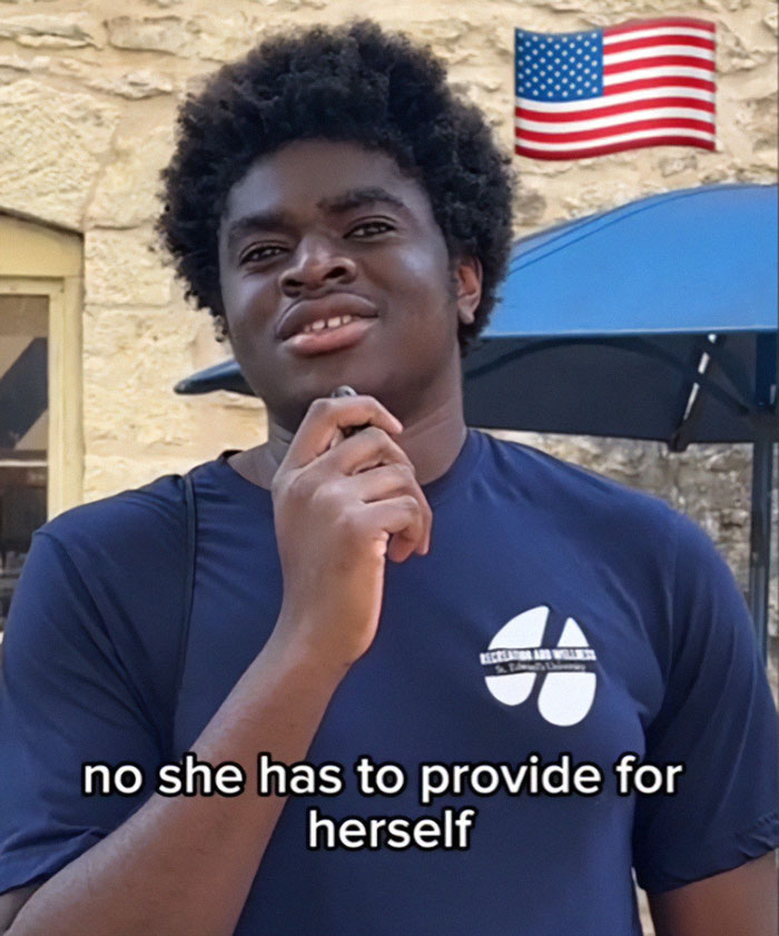 “Nah, she has to provide for herself,” an American subsequently replied. “She’s an adult.”