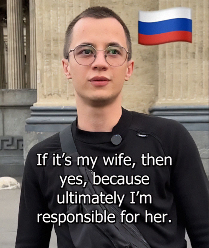Seconds later, the video panned to a Russian man stating, “If it’s my wife, then yes, because ultimately I’m responsible for her.”