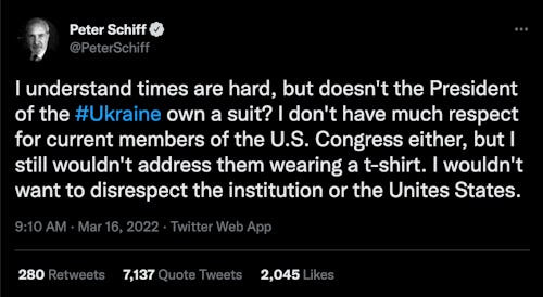 Peter Schiff is known primarily as one of the guys who correctly predicted the Great Recession, and secondarily known as being wrong about virtually everything else. His hobbies include financing Ron Paul Presidential campaigns and helping enable tax evasion for international organized crime through his banking operation based out of Puerto Rico. He’s also a patriot who loves this nation, and won’t stand by while foreigners forget to show the proper amount of groveling deference — no matter how bombarded by Russian missiles or threatened by assassination attempts they are.