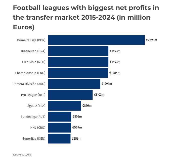 Brasileirão, the top tier of Brazilian football, and the Dutch Eredivisie share the second spot on the list. Both leagues have made a net profit of €1,493 million in their respective transfer dealings over the past decade.