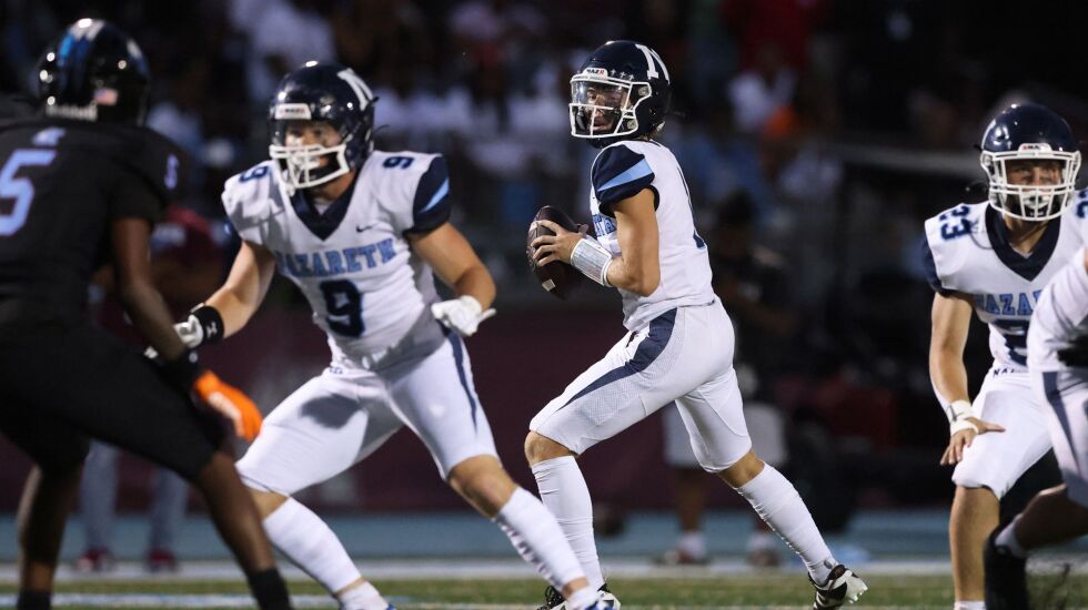 Nazareth (0-1) gave up two long touchdown runs on Kankakee’s first three offensive plays last week, eventually rallied to tie the score but fell 33-26. Junior Gabe Kaminski, a four-star prospect as an edge rusher, showed his offensive chops by catching a 50-yard pass in the loss. Third-year starting quarterback Logan Malachuk is another playmaker. York (1-0) opened with a 35-17 victory against Glenbrook South. Sean Winton passed for 277 yards and three touchdowns, Luke Mailander had seven catches for 221 yards and a score and Jake Melion ran for 165 yards. Cole Ostendorf, who had 3.5 tackles for loss and 1.5 sacks, paces the Dukes’ defense.