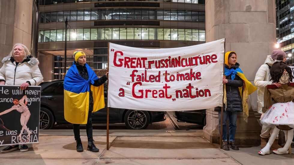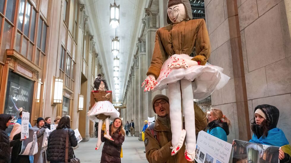 A few dozen pro-Ukrainian demonstrators gathered Wednesday night outside the Civic Opera House to denounce the Joffrey Ballet’s staging of a ballet based on a Russian novel amid Russia’s deadly invasion of Ukraine.