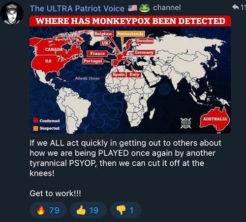 A quick perusal of various rightwing Telegram channels showcases a rapidly increasing number of QAnon personalities roping monkeypox into their overarching conspiracy theories. One of the most prominent is currently highlighting that AstraZeneca’s COVID-19 vaccines contain weakened chimpanzee adenovirus vector. True believers are pointing towards this as proof of some sort of diabolical scheme, despite the fact that chimpanzee adenovirus is most certainly not monkeypox, and is more akin to a common cold. It’s also not remotely dangerous to anyone, seeing as how the AstroZeneca vaccines’ included adenovirus has been genetically modified so as to be “impossible to grow in humans.”
