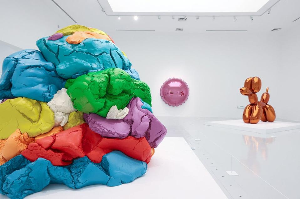 Jeff Koons fondly recalls when his toddler son Ludwig proudly presented him with a multi-colored mound of Play-Doh, announcing “Voilà!” That experience inspired a two-decades-long project that produced five unique versions of a massive polychromed aluminum sculpture that’s meticulously textured to resemble the popular modeling compound.