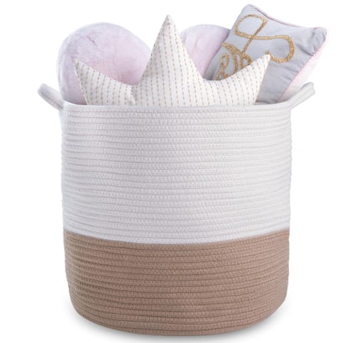 If you need a spot for all those miscellaneous toys, blankets, pillows, and other odds and ends, tossing them into a storage basket is a great option. It’s made of cotton blend rope that’s soft, durable, and flexible with built-in handles to easily carry it around. Plus, it’s super deep and the neutral tones go with almost any decor style.
