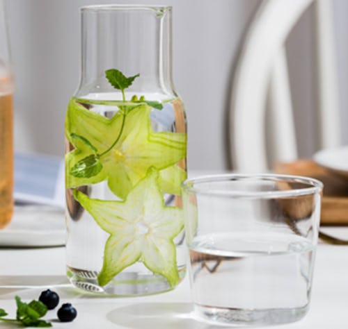 A handy glass carafe & cup set that looks elegant on your table or nightstand