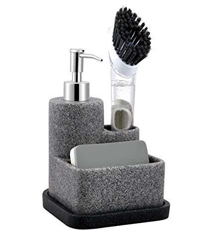 For a chic and decluttered kitchen sink look, check out this soap caddy with compartments for everything you need. It has a pump-top soap dispenser with a zinc alloy nozzle that won’t leak, a tall brush holder to keep it upright, and a long space to store your sponge. The whole thing has bottom holes to drain excess water and a removable drip tray.