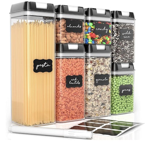 Storing your food in these matching containers will give your pantry the uniform, super sleek look of a professional organizer’s dreams. They come in five height sizes, but they’re the same square shape so they’re stackable. Each one has a leakproof, airtight lid that will keep your food fresher longer, and they even come with chalkboard sticker labels.