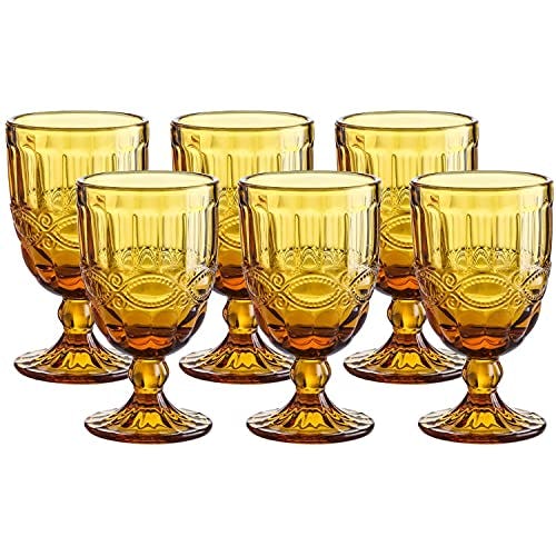 WHOLE HOUSEWARES | Colored Amber Drinking Glasses | Amber Glassware |Pressed Pattern Wine Amber Glass Goblet with Stem for Wedding | Set of 6 | 8.7 Ounce (Amber)