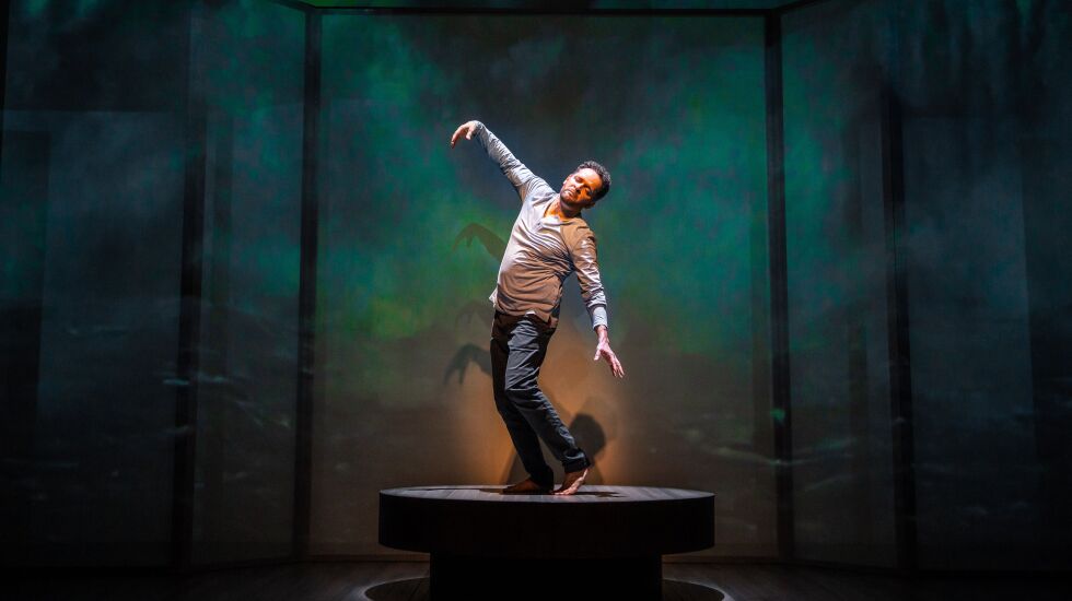 With “Misha” flickering silvery and bright behind him in Jared Mezzocchi’s projection design, Antonio tries to mimic the famed dancer’s seemingly impossible leaps and turns. It’s a breathtaking, kinetic portrait of art imitating life imitating art impacting life.