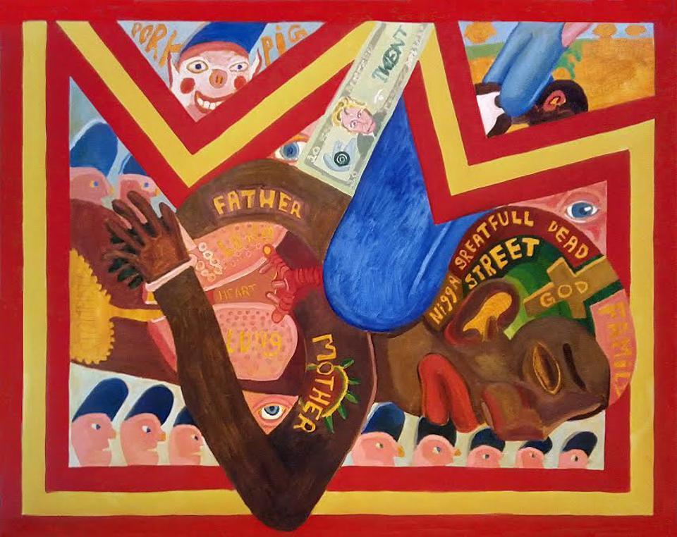 Williams’ most recent work featured an explosive and visceral depiction of racial strife, black power, and police brutality. The white gaze magnified by brazen images of white police officers as pigs, blue eyes leering, and white hands grabbing, Williams’ detailed work incorporates symbols of unfair wealth distribution, greed, and religion, underpinning the rampant racism that permeates this nation’s systems of power and authority.