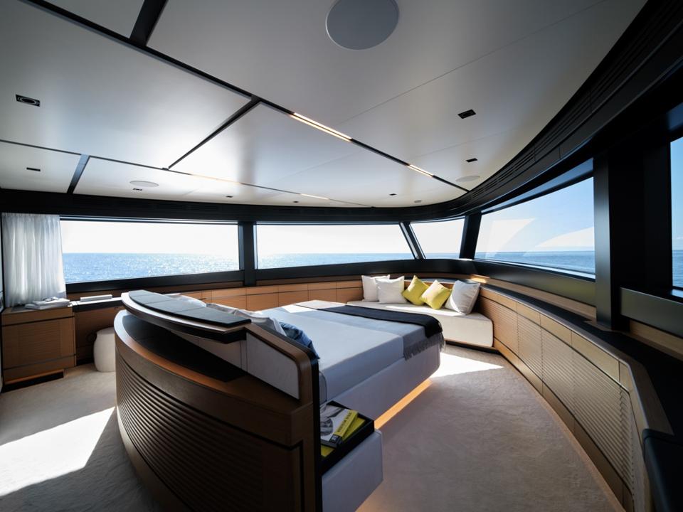 The interior of the model I saw in Monaco features the master cabin with two separate bathrooms on the main deck, while the VIP and two guest cabins are on the lower deck.