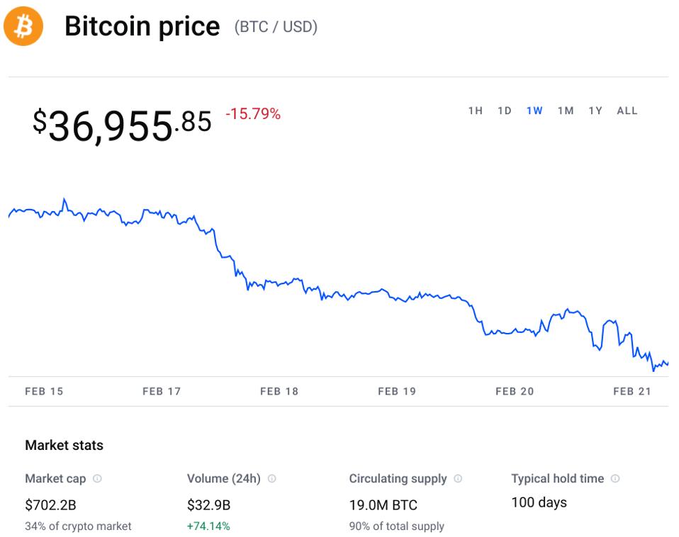The bitcoin price fell to lows of $36,370 per bitcoin last night before rebounding slightly, down almost 20% on this time last week. Ethereum and other top ten cryptocurrencies including BNB, solana, cardano and XRP all fell even more sharply, with cardano and XRP leading the market lower with 15% declines over the last 24 hours.
