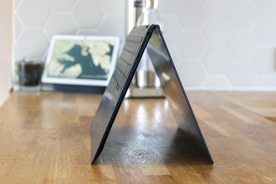 The main event is the Galaxy Book's ability to turn into a tablet. The display folds backwards (hence the “360” title) and the screen automatically rotates, but tablet mode has to be manually turned on. Once in, you can put the device in tent mode (see below) and watch content or use the touchscreen display.
