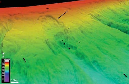 The historic slides we found range in size from less than 0.5 cubic km to more than 20 cubic km – the same as roughly 300 to 12,000 Melbourne Cricket Grounds. The slides travelled down slopes that were less than 6° on average (a 10% gradient), which is low in comparison to slides on land, which usually fail on slopes steeper than 11°.