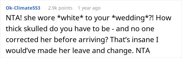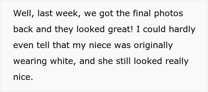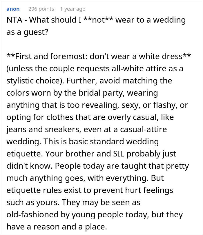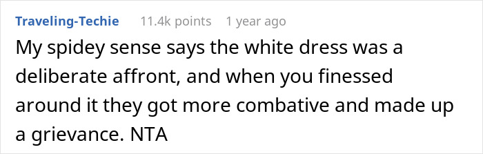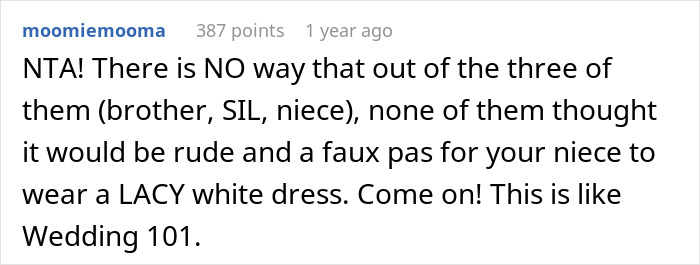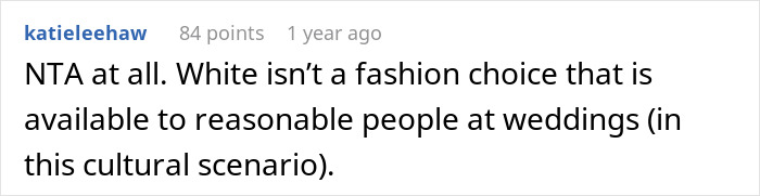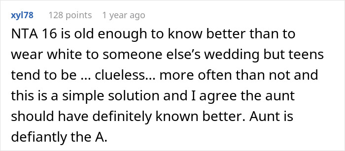 However, in this case, the niece’s choice of an all-white dress was clearly a misstep. “Surely she knew about the ‘don’t wear white to a wedding’ rule,” Hayes remarked. “In cultures where it’s a ‘rule,’ it’s widely known—even among teenagers.”