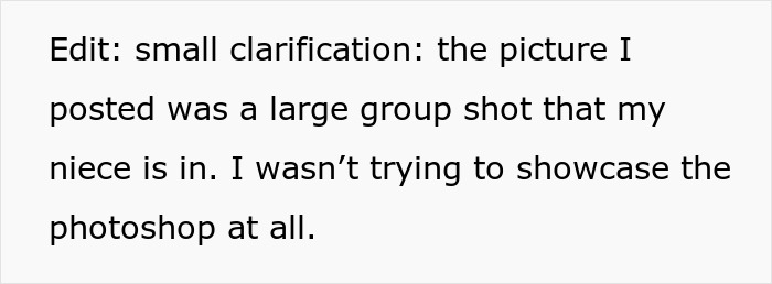 But what if the niece refused to cooperate? Hayes reassured that the bride would still have the right to move forward with her decision. “If the niece is resistant and refuses to come on board, I would encourage the bride to go ahead and photoshop anyway. She’s done all she can to inform the niece of her intentions and invite her to be part of the solution. If the niece doesn’t agree, so be it.”