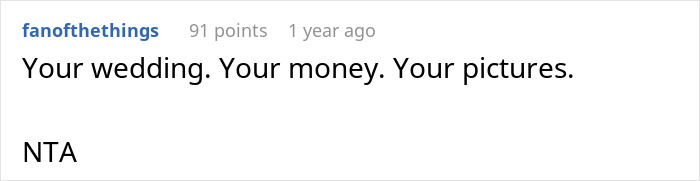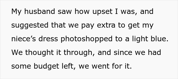 Instead of making a scene, the bride decided to quietly photoshop the dress to a different color in the family photos. What seemed like a simple solution, however, sparked a whole new family drama.