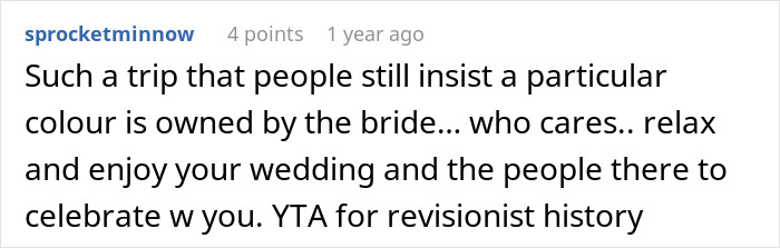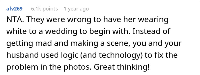 “She could explain that this is a well-known, though often unspoken, wedding etiquette rule that guests shouldn’t wear white, and that she didn’t want the photos to reflect this,” Hayes added.