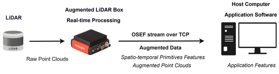 According to Raul Bravo, President of Outsight, outside of automotive applications, customers in other application domains do not have the expertise, resources or willingness to invest in the technology required to interact directly with LiDAR hardware and data. They need a seamless plug-and-play solution that allows them to access the salient information coming out of the LiDAR. The Augmented LiDAR box (Figure 4) is an edge device with embedded real-time software that interfaces to most commercial LiDARs (Velodyne, Ouster, Robosense, Hesi, Livox among others) and provides a universal interface for power, control and data to the end user’s application. It also provides various processed data outputs like object lists and types, as well as SLAM (Simultaneous Location and Mapping) which enables real time situational tracking of the different objects.