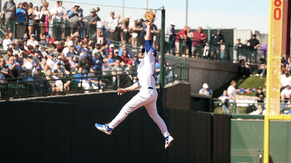 SURPRISE, Ariz. – Take a freeze frame of Patrick Wisdom’s leaping catch in the Cubs’ spring training opener, and he almost looks like a goalkeeper.