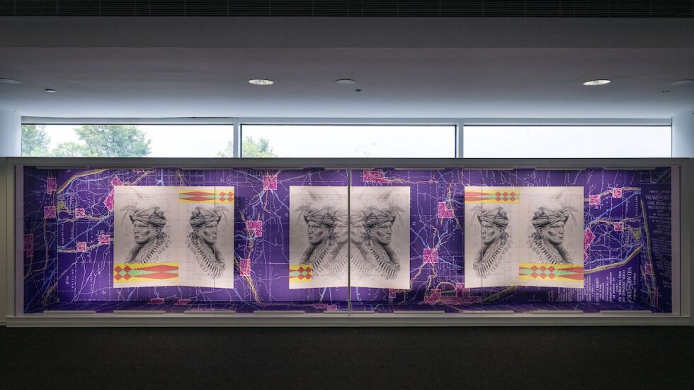 “From a hand-drawn image on ledger paper that survived the Great Chicago Fire, combined with historical maps from a time when the Fox and other local tribes lived freely in this area, the piece represents resilience and reverence for the contributions of indigenous peoples of Chicago.”