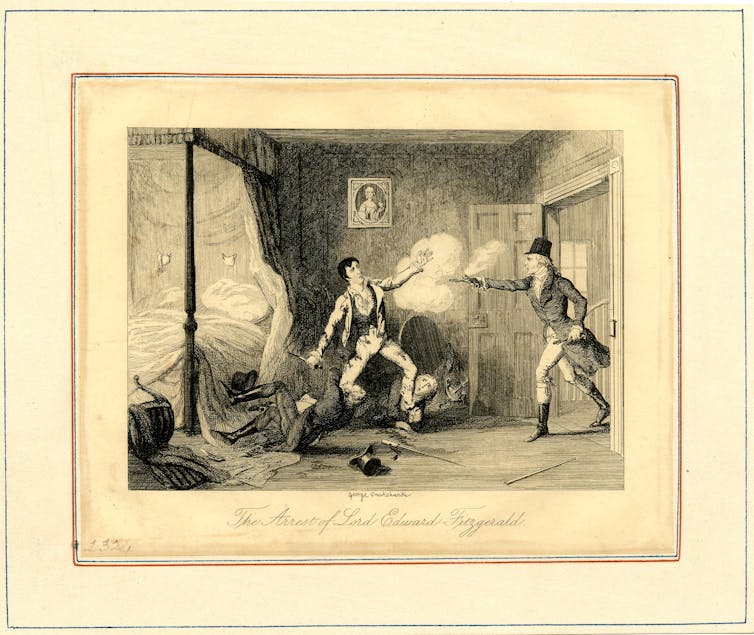 Lord Edward Fitzgerald (1763-98) is most known as a leading conspirator in the revolutionary Society of United Irishmen, who planned to overthrow the British in Ireland. His death in a Dublin prison in 1798 after leading the failed rebellion ensured, as historian Daniel Gahan notes, Fitzgerald’s status in Ireland as a “toweringly romantic figure in Irish history.”