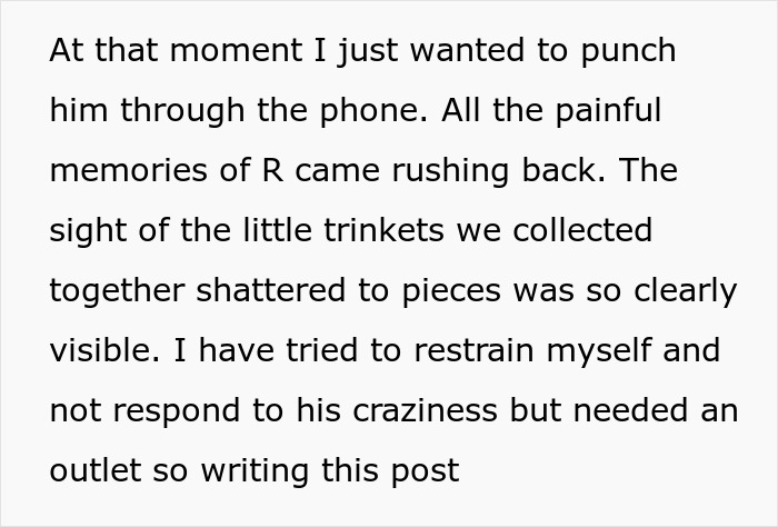 So, understandably, the OP was crushed by feelings like that. In fact, he was so destroyed that he wasn’t able to look for another place to live, as his wife’s house now belonged to her son. He asked him to stay there for a little bit, at least until he could collect himself. As K. Himmes told us, “It is extremely important to allow yourself to grieve in a way that feels appropriate.”