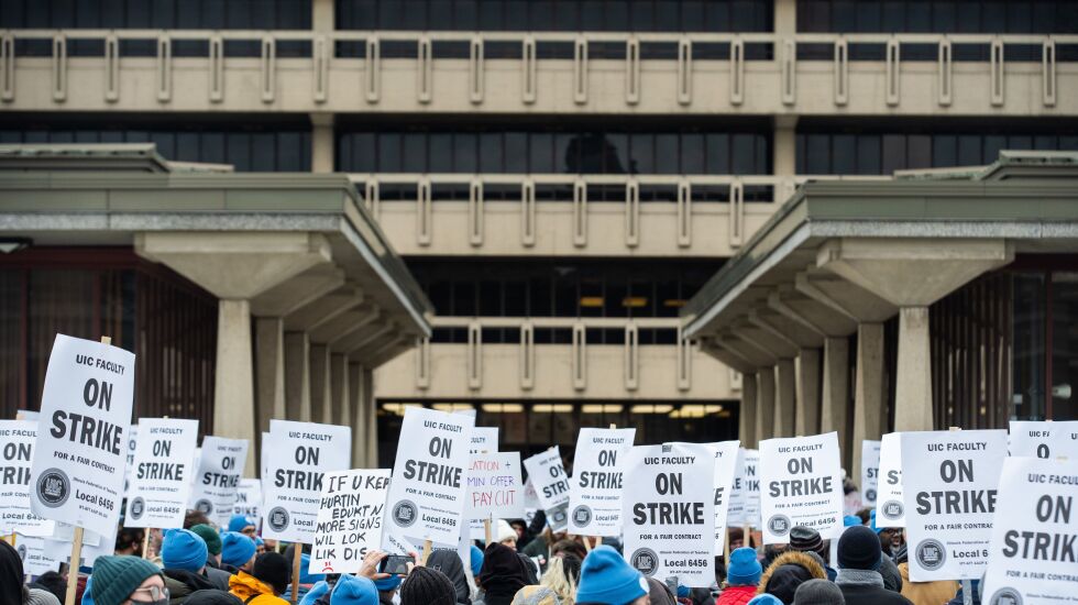 Hundreds of faculty at the University of Illinois Chicago hit picket lines across their Near West Side campus Tuesday on the first day of an indefinite strike after nine months of contract negotiations.
