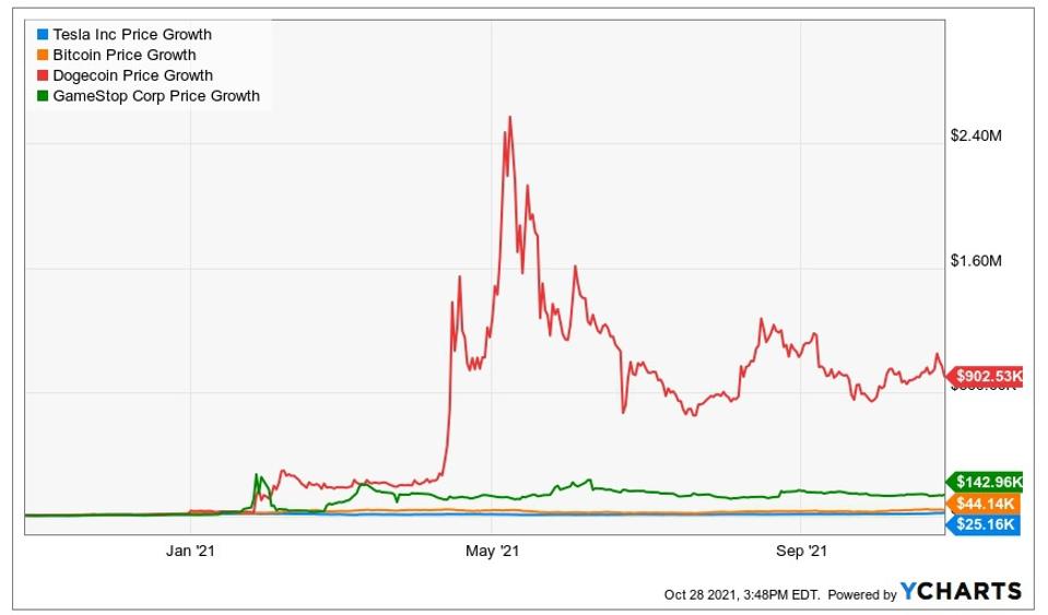 Had you invested $10,000 in Dogecoin a year ago you would still be up about $900,000 despite its extreme volatility. A GameStop