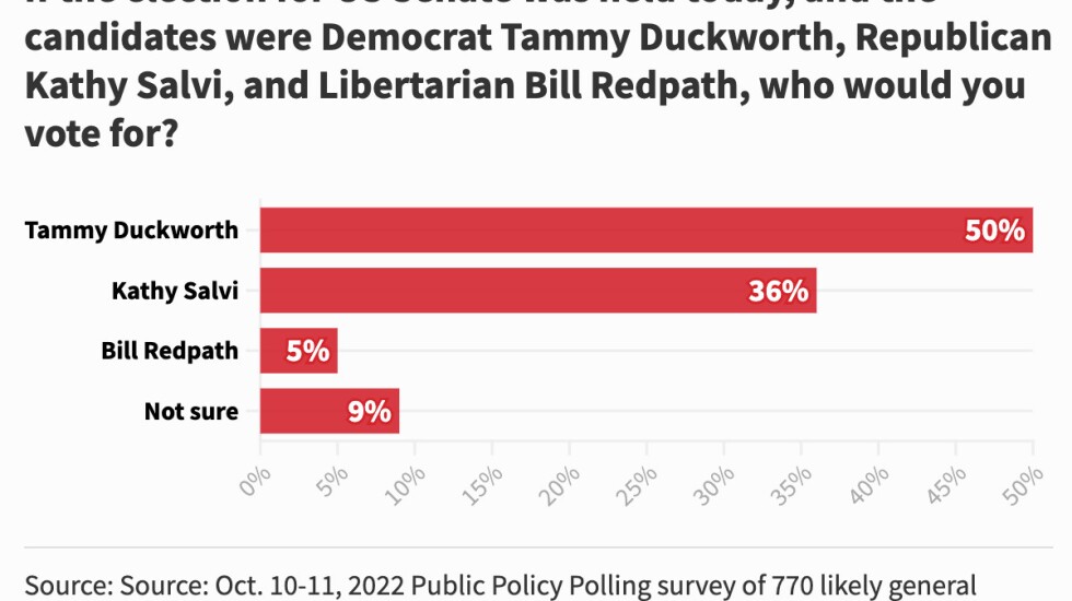 The poll also found U.S. Sen. Tammy Duckworth leading her Republican opponent, Kathy Salvi, 50% to 36%, with 5% supporting Libertarian Bill Redpath and another 9% undecided.