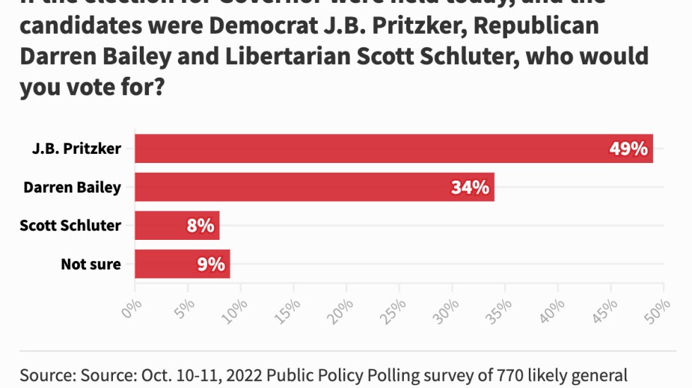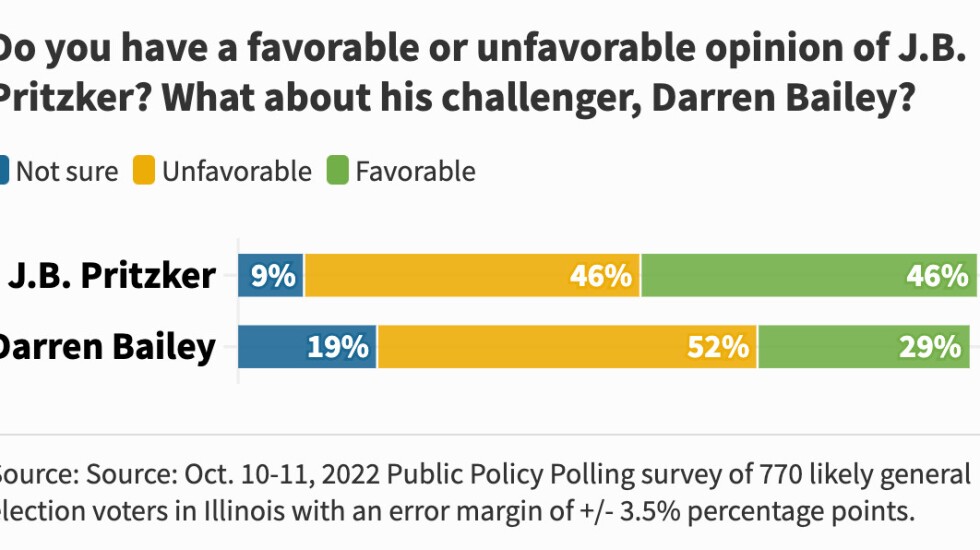 In the governor’s race, the poll found Pritzker leading Bailey 49% to 34%, with Libertarian Scott Schluter boasting 8% — with 9% of those polled still undecided. When it comes to offering their opinions of the candidates, 46% of those surveyed held favorable views of Pritzker, 46% unfavorable and 9% were unsure.