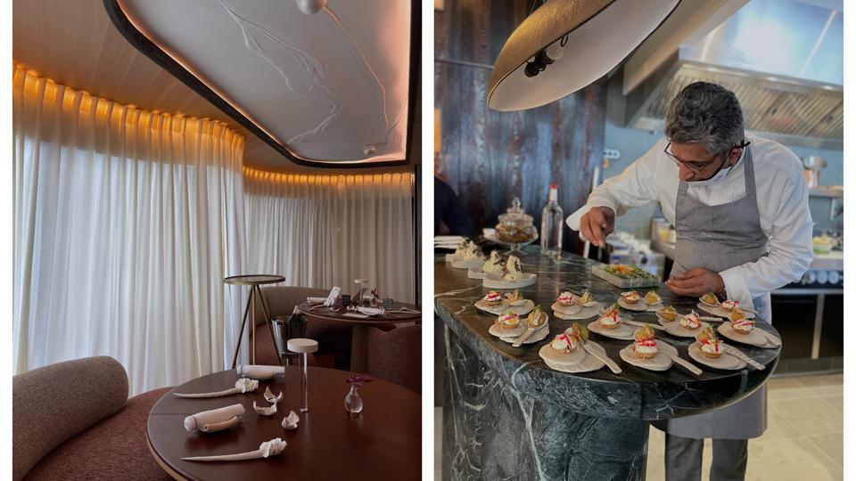 You'll find the chef's restaurant at the Grandes Alpes Hotel & Spa in the heart of Courchevel in a brand new space designed like a cocoon of light flowing fabrics coiffed by a lick of white organically molded ceiling recalling the shell of a crab or sea urchin as an ode to nature, co-created by Wahid and designers Tristan Auer and Jérôme Bugara.