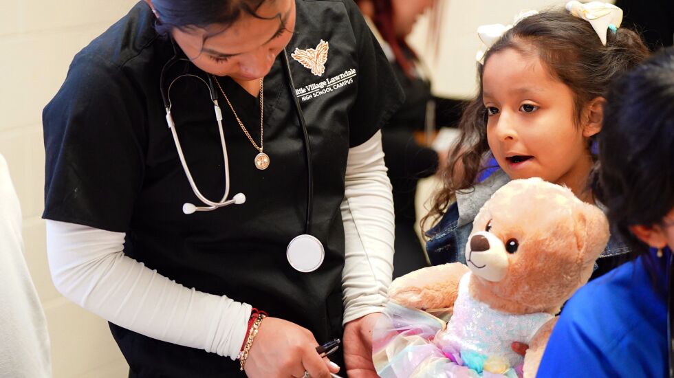 She was one of several Chicago Public Schools juniors and seniors who performed a full round of check-ups Thursday on more than 200 stuffed animals brought to them by grade schoolers at Eli Whitney Elementary.