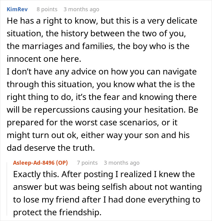 The story began with the woman asking for advice: whether or not she should tell her childhood friend about a child he knew nothing about. In a later update and comments under both posts, u/Asleep-Ad-8496 explained that she decided to keep their son a secret for the child’s and the father’s futures.